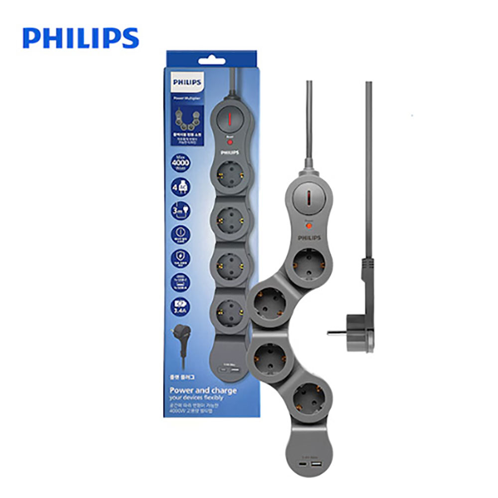 [필립스] 서지보호 플렉시블 고용량 USB 납작 콘센트 멀티탭 4구 3M CHP5242GB